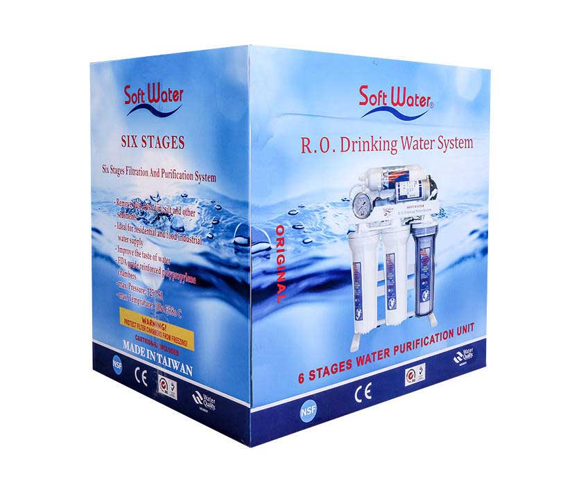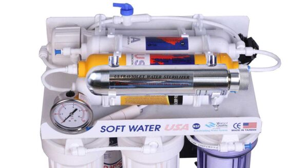 دستگاه تصفیه آب سافت واتر soft water یک برند قدیمی و شناخته شده و معتبر و پیشترفته ترین و حرفه ای ترین دستگاه تصفیه آب خانگی با فناوری سیستم تصفیه اشعه فرابنفش + قلیایی کننده آب + اسمز معکوس میباشد (RO+UV+ORP) که در 8 مرحله و 8 فیلتر آب را تصفیه میکند که شامل فیلتر های PP + UDF + CTO + MEMBRANE + POST CARBON + MINERAL + ORP + UV همراه با مخزن ذخیره آب 4 گالن ، فیلتر ممبران 13 لایه 75 گالن آمریکا ، بهترین فیلتر اشعه فرابنفش (UV) ، هوزینگ های دوبل اورینگ برای آب بندی بهتر و با قدرت گرفتن کلیه ناخالصی های آب تا 0/0001 میکرون و پایین آوردن سختی آب (TDS) و نیترات و نیتریت و تنظیم PH آب و بالغ بر99.99 درصد از ویروس های در آب را از بین میبرد.